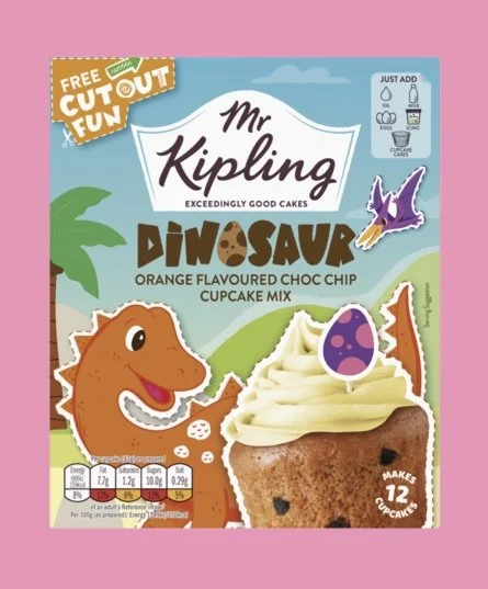 Packaging of Mr. Kipling Dinosaur orange flavored chocolate chip cupcake mix with a cartoon dinosaur and a cupcake topped with white icing and small purple dinosaur decoration.